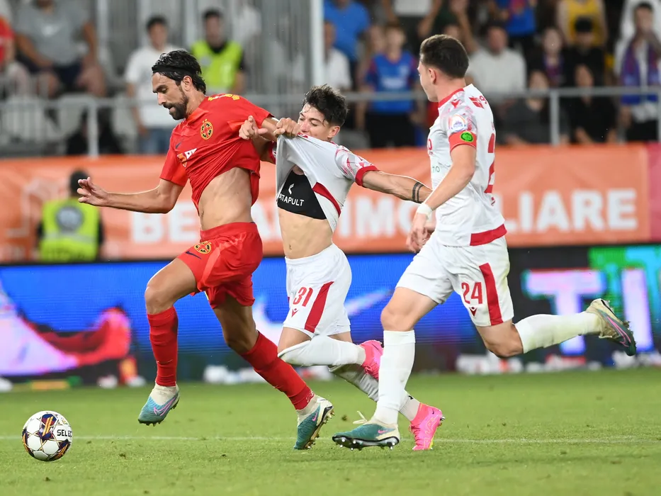 Andrea Compagno si Costin Ionut Amzar in meciul de fotbal dintre FCSB si Dinamo Bucuresti, din cadrul Superligii Superbet, desfasurat pe Stadionul National Arcul de Triumf din Bucuresti, sambata 22 iulie 2023. © FOTO:Razvan Pasarica/SPORT PICTURES