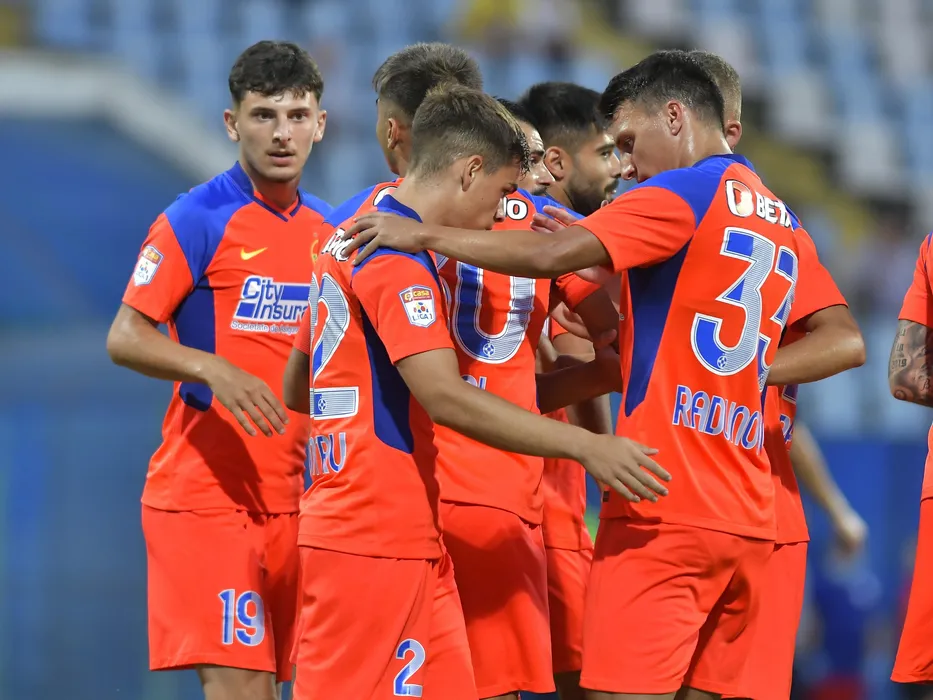 Ianis Stoica si Risto Radunovic il felicita pe Cristian Cosmin Dumitru dupa un gol marcat in meciul amical de fotbal dintre FC Buzau si FCSB, disputat pe Stadionul Gloria din Buzau, vineri 9 iulie 2021. © FOTO:Razvan Pasarica/SPORT PICTURES