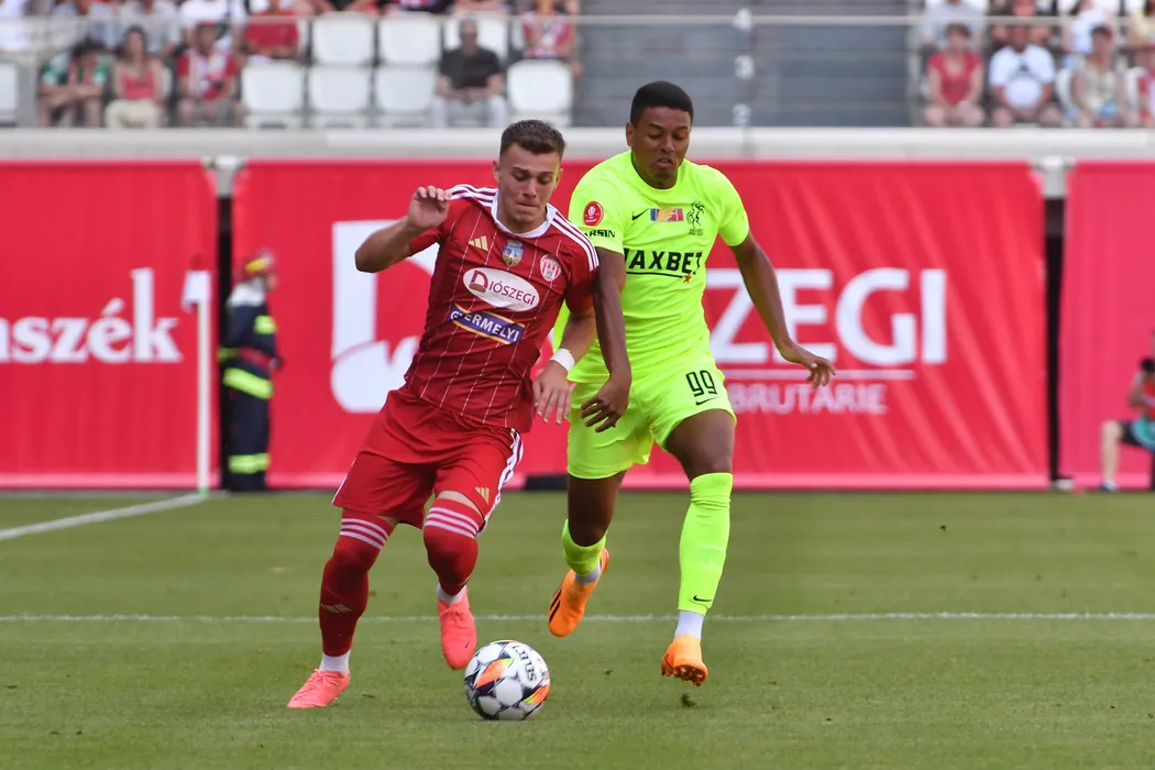 Darius Adrian Oroian și Goncalves Tailson Pinto în meciul de fotbal dintre Sepsi OSK Sfantu Gheorghe și Poli Iași, contând pentru SuperLiga Superbet, desfășurat pe Stadionul SEPSI Arena OSK din Sfântu Gheorghe,sâmbătă 13 iulie 2024. © FOTO: Bogdan BALAS/SPORT PICTURES
