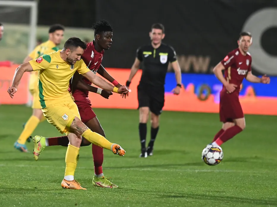Mihai Andrei Panait si Emmanuel Yeboah in meciul de fotbal dintre CS Mioveni si CFR Cluj, contand pentru Superliga Superbet, desfasurat pe Stadionul Orasenesc din Mioveni, duminica 13 noiembrie 2022. © FOTO:Razvan Pasarica/SPORT PICTURES
