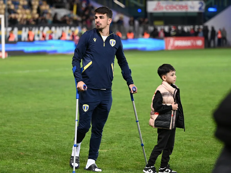 Sergiu Catalin Hanca in carje alaturi de fiul sau dupa meciul de fotbal dintre Petrolul Ploiesti si FCSB, din cadrul Superligii Superbet, desfasurat pe Stadionul Ilie Oana din Ploiesti, sambata 28 octombrie 2023. © FOTO:Razvan Pasarica/SPORT PICTURES