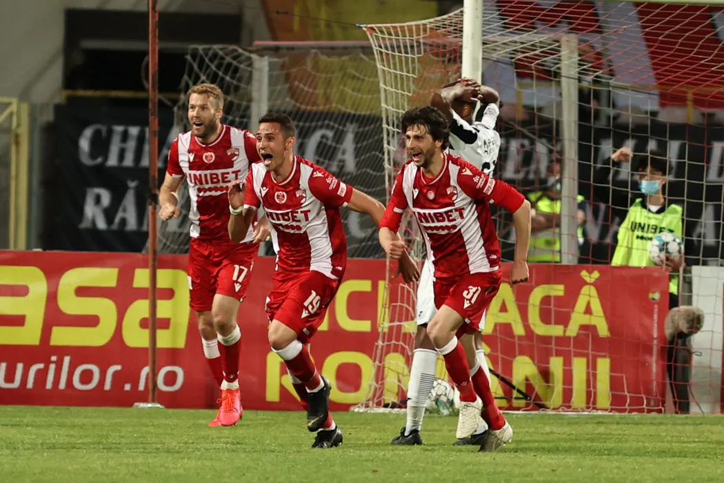 Jucatorii formatiei Dinamo reactioneaza dupa ce coechipierul lor, Andrei Radu, inscrie un gol in timpul meciului de fotbal contra echipei AFC Astra din semifinalele Cupei Romaniei, disputat pe stadionul Dinamo din Capitala, marti, 11 mai 2021 GEORGE FILIP / MEDIAFAX FOTO