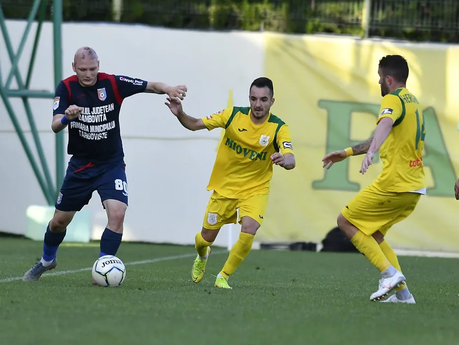 Denis Constantin Dumitrascu si Ionut Radescu in meciul de fotbal dintre CS Mioveni si Chindia Targoviste, contand pentru mansa retur a barajului pentru promovare in Liga 1 Casa Pariurilor, desfasurat fara spectatori pe Stadionul Orasenesc din Mioveni, miercuri 12 august 2020. © FOTO:Razvan Pasarica/SPORT PICTURES