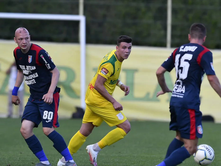 Denis Constantin Dumitrascu si Valentin Balint in meciul de fotbal dintre CS Mioveni si Chindia Targoviste, contand pentru mansa retur a barajului pentru promovare in Liga 1 Casa Pariurilor, desfasurat fara spectatori pe Stadionul Orasenesc din Mioveni, miercuri 12 august 2020. © FOTO:Razvan Pasarica/SPORT PICTURES
