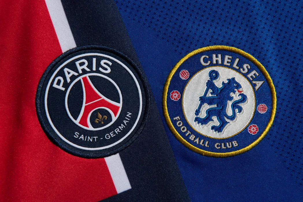 MANCHESTER, ENGLAND - SEPTEMBER 01: The Paris Saint-Germain and Chelsea club crests on their first team home shirts on September 1, 2020 in Manchester, United Kingdom. (Photo by Visionhaus)
