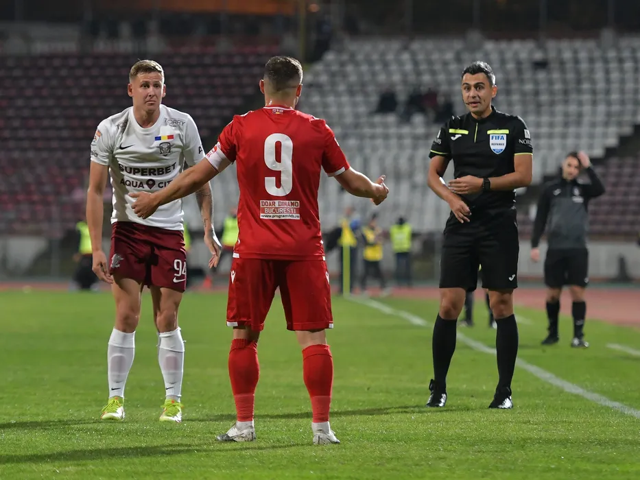 Catalin Florin Hlistei, Gabriel Andrei Torje si arbitrul central Horatiu Mircea Fesnic in meciul de fotbal dintre Dinamo Bucuresti si Rapid Bucuresti, contand pentru Liga 1 Casa Pariurilor, desfasurat pe Stadionul Dinamo din Bucuresti, sambata 23 octombrie 2021. © FOTO:Razvan Pasarica/SPORT PICTURES