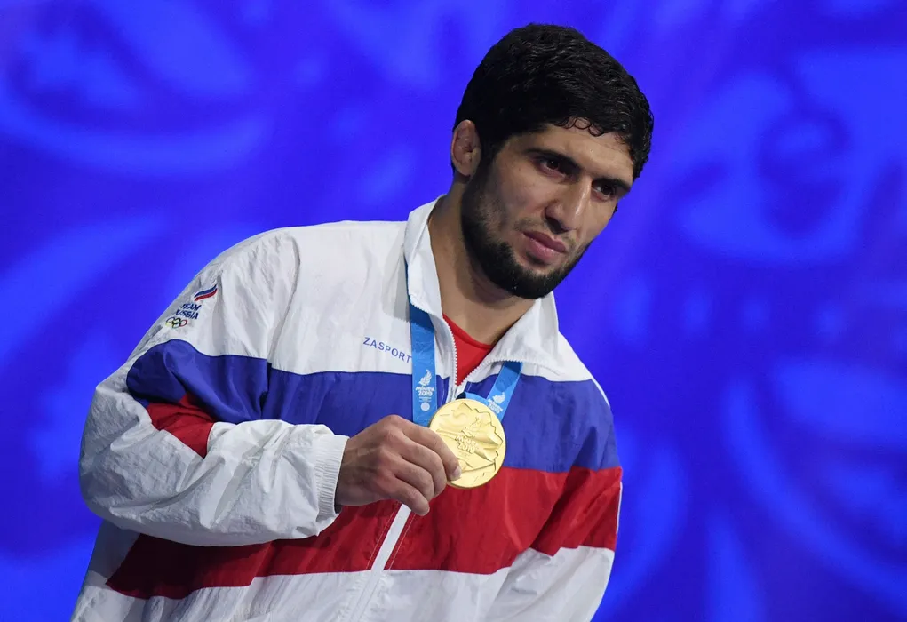 5928762 26.06.2019 Russia's Zaurbek Sidakov shows off his gold medal after the men's wrestling freestyle -74kg match at the 2nd European Games in Minsk, Belarus. Alexey Filippov / Sputnik
