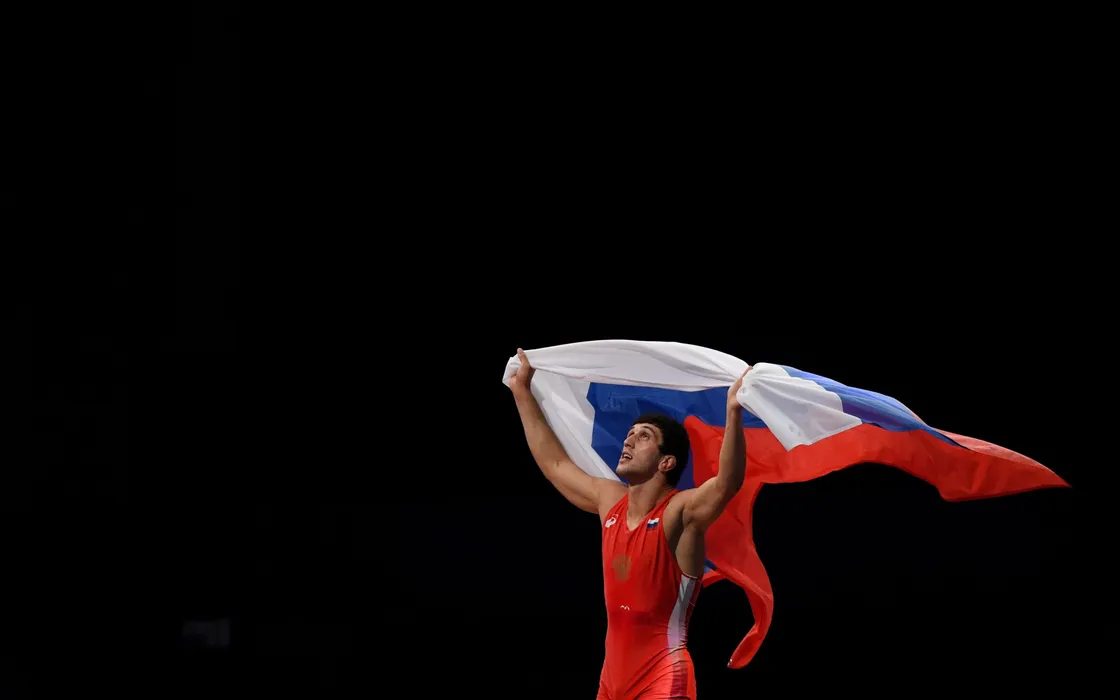 5928783 26.06.2019 Russia's Zaurbek Sidakov celebrates his win at the final men's wrestling freestyle -74kg match against Turkey's Soner Demirtas at the 2nd European Games in Minsk, Belarus. Alexey Filippov / Sputnik