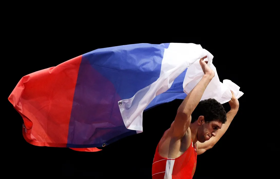5928784 26.06.2019 Russia's Zaurbek Sidakov celebrates his win at the final men's wrestling freestyle -74kg match against Turkey's Soner Demirtas at the 2nd European Games in Minsk, Belarus. Alexey Filippov / Sputnik