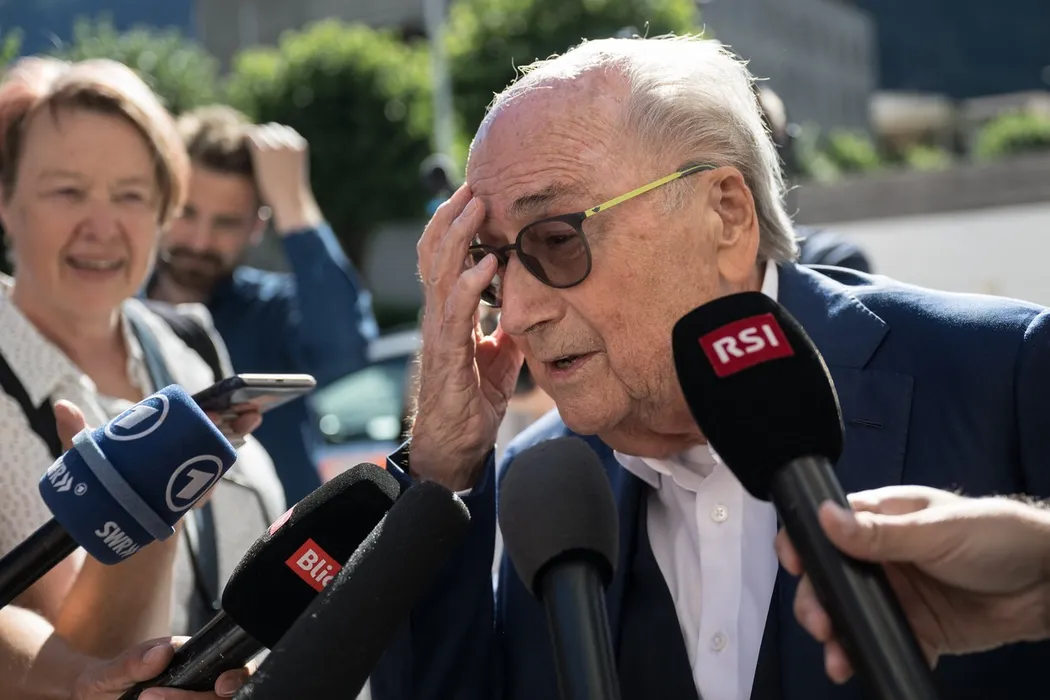 Former FIFA president Sepp Blatter speaks to journalists as he arrives to Switzerland's Federal Criminal Court for listen the verdict of his trial over a suspected fraudulent payment, in the southern Switzerland city of Bellinzona, on July 8, 2022. The Bellinzona court will hand down its verdict in the trial of former UEFA president Michel Platini and former FIFA president Sepp Blatter. Blatter and Platini are being tried over a two-million-Swiss-franc ($2 million) payment in 2011 to the former France captain, who by that time was in charge of European football's governing body UEFA.,Image: 705887048, License: Rights-managed, Restrictions: , Model Release: no