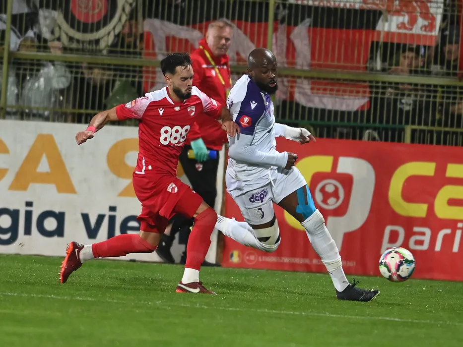 Gorka Larrucea si Paul Arnold Garita in meciul de fotbal dintre FC Arges si Dinamo Bucuresti, contand pentru mansa retur a Barajului pentru mentinerea in Superliga Superbet, desfasurat pe Stadionul Orasenesc din Mioveni, sambata 3 iunie 2023. © FOTO:Razvan Pasarica/SPORT PICTURES