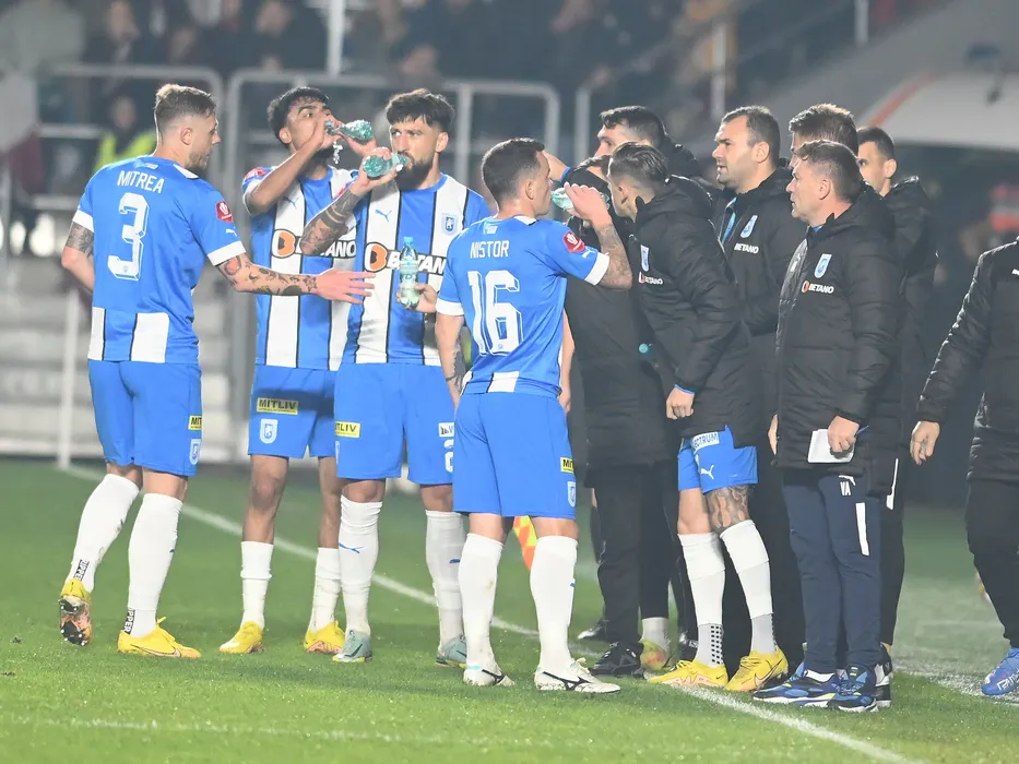 Fotbalistii craioveni Bogdan Alexandru Mitrea, Stefan Baiaram, Paul Papp si Dan Nicolae Nistor la o pauza de hidratare luata la meciul de fotbal dintre Rapid Bucuresti si Universitatea Craiova, contand pentru Superliga Superbet, desfasurat pe Stadionul Rapid Giulesti din Bucuresti, sambata 12 noiembrie 2022. © FOTO:Razvan Pasarica/SPORT PICTURES