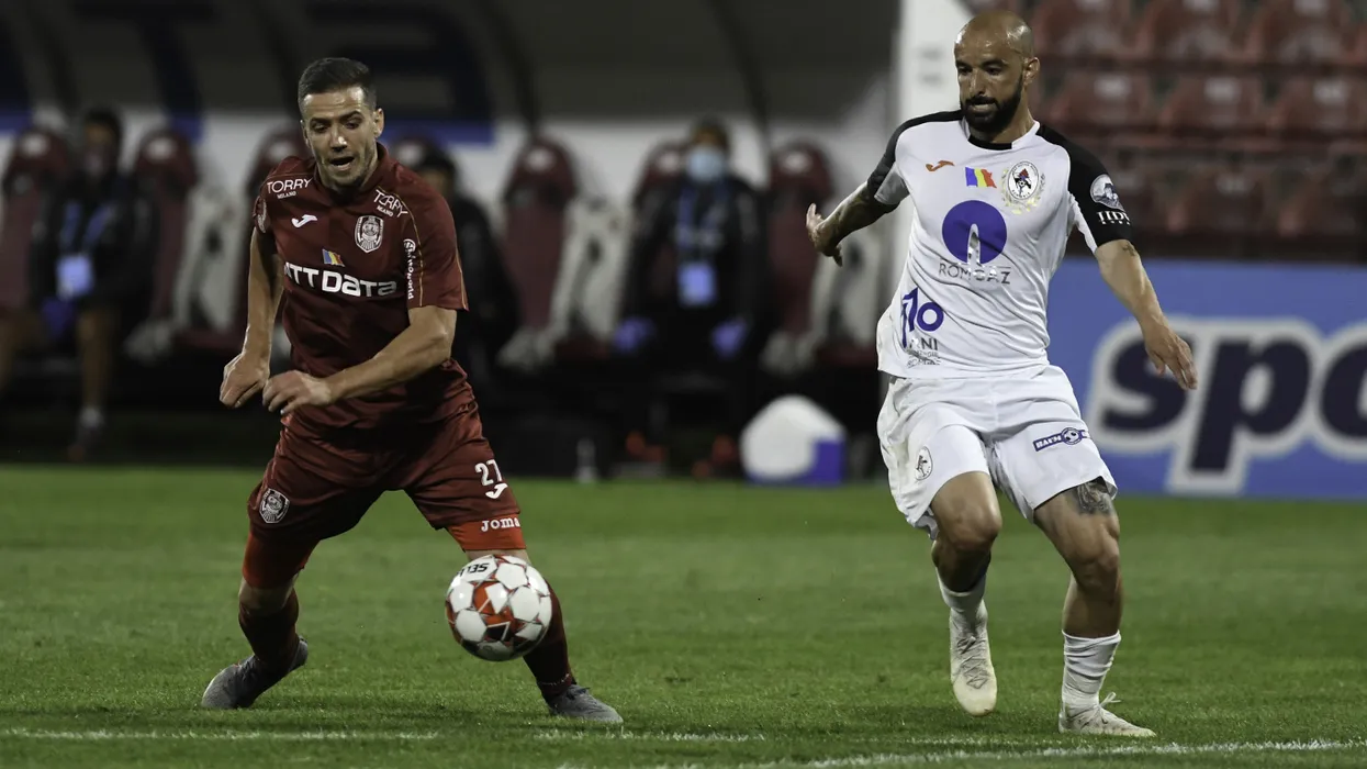 Alexandru Chipciu (S), de la CFR Cluj, lupta pentru balon cu Gabriel Moura (D), de la Gaz Metan Medias, in timpul meciului de fotbal din etapa a VII-a a play-off-ului Ligii 1, disputat pe stadionul Dr. Constantin Radulescu din Cluj-Napoca, luni, 13 iulie 2020. FLAVIU BUBOI / MEDIAFAX FOTO