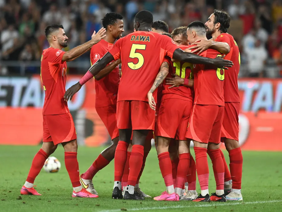 Bucurie a fotbalistilor stelisti dupa un gol marcat cu Valentin Cretu, Siyabonga Ngezana si Andrea Compagno in meciul de fotbal dintre FCSB si Universitatea Craiova, din cadrul Superligii Superbet, desfasurat pe Stadionul Steaua-Ghencea din Bucuresti, sambata 2 septembrie 2023. © FOTO:Razvan Pasarica/SPORT PICTURES