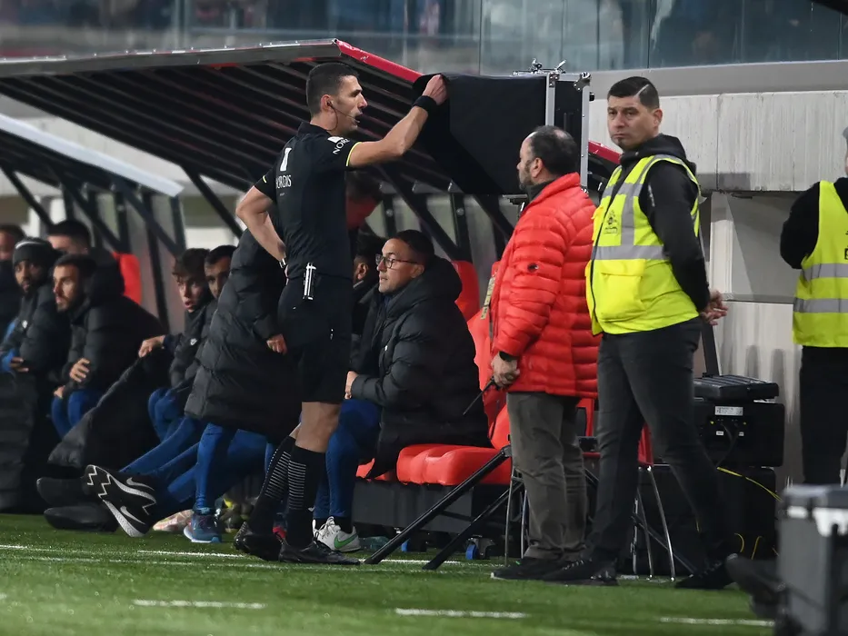 Arbitrul central Marcel Birsan consulta VAR la meciul de fotbal dintre Sepsi OSK Sfantu Gheorghe si FCSB, contand pentru Superliga Superbet, desfasurat pe Sepsi Arena din Sfantu Gheorghe, luni 24 octombrie 2022. © FOTO:Razvan Pasarica/SPORT PICTURES