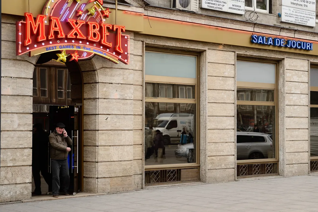 Un barbat iese dintr-o sala de jocuri, in Bucuresti, vineri, 30 ianuarie 2015. MIHAI DASCALESCU / MEDIAFAX FOTO