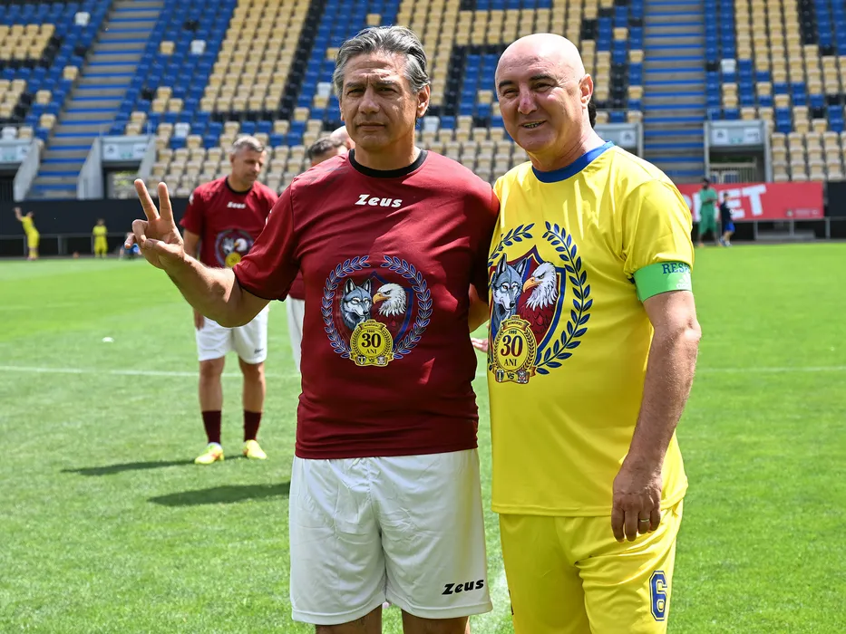 Adrian Matei si Valeriu Răchită la meciul amical de fotbal old boys dintre Petrolul Ploiesti si Rapid Bucuresti, reeditarea finalei Cupei Romaniei, editia 1995, desfasurat pe stadionul Ilie Oana din Ploiesti, sambata 21 iunie 2025. © FOTO:Razvan Pasarica/SPORT PICTURES