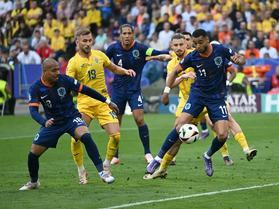 Donyell Malen, Denis Drăguş, Virgil van Dijk, Radu Drăgușin si Cody Gakpo in meciul dintre Romania si Olanda, din cadrul UEFA EURO 2024, desfasurat pe Fussball Arena din Munchen, marti 2 iulie 2024. © FOTO:Razvan Pasarica/SPORT PICTURES