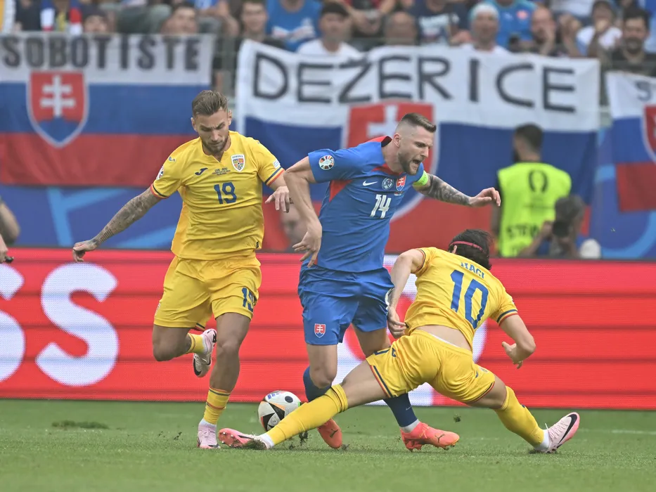 Denis Drăguş, Milan Škriniar si Ianis Hagi in meciul de fotbal dintre Slovacia si Romania, contand pentru UEFA EURO 2024, desfasurat pe Frankfurt Arena din Frankfurt, miercuri 26 iunie 2024. © FOTO:Razvan Pasarica/SPORT PICTURES