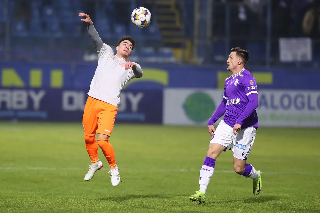 David Mario Irimia si Claudiu Valentin Micovschi in meciul de fotbal dintre Metaloglobus Bucuresti si FC Arges, contand pentru Superliga Superbet, desfasurat pe Clinceni Arena din Clinceni, vineri 23 ianuarie 2026. © FOTO:SPORT PICTURES