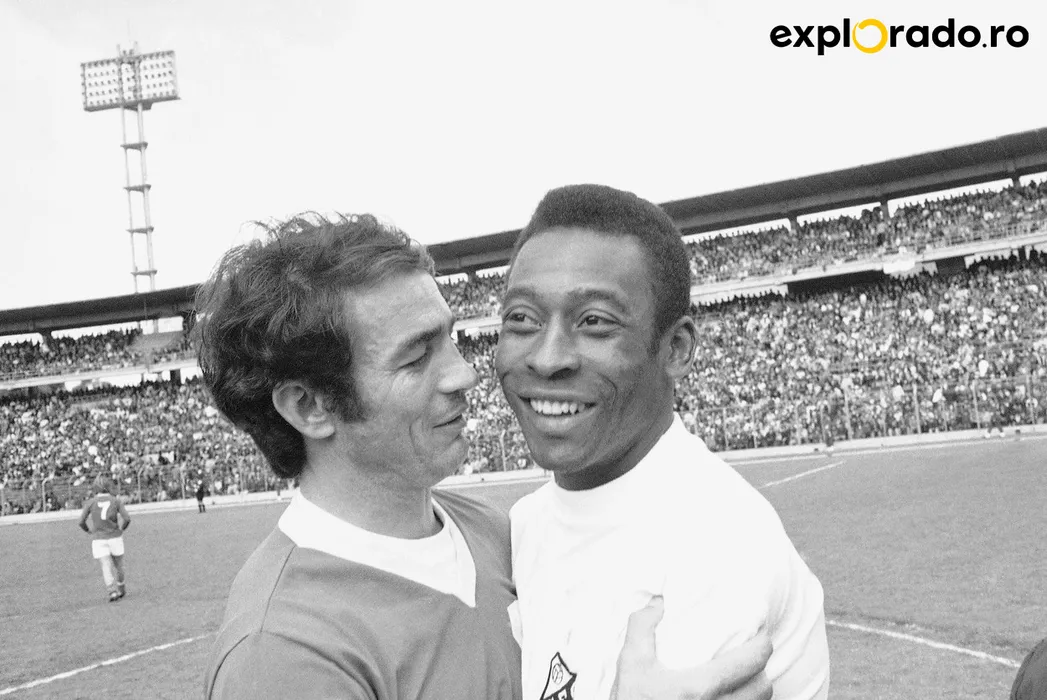 Soccer King Pele, of Brazil, right, is hugged by the famous Yugoslavian player Dragoslav Sekularak, now playing for ?Millonarios? of Bogota, before the friendly game between Millonarios and Santos of Sao Paulo on August 29, 1971 in Bogota. Sekularak reportedly said that Pele is not world?s player, but denied it today and hugged Pele.,Image: 598602009, License: Rights-managed, Restrictions: This content is intended for editorial use only. For other uses, additional clearances may be required., Model Release: no