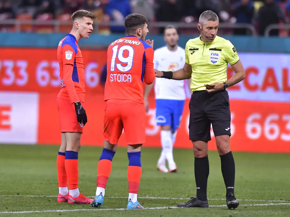 Arbitrul central Radu Petrescu discuta cu Octavian George Popescu si Ianis Ilie Stoica in meciul de fotbal dintre FCSB si Farul Constanta, contand pentru Liga 1 Casa Pariurilor, desfasurat pe Arena Nationala din Bucuresti, duminica 27 februarie 2022. © FOTO:Razvan Pasarica/SPORT PICTURES