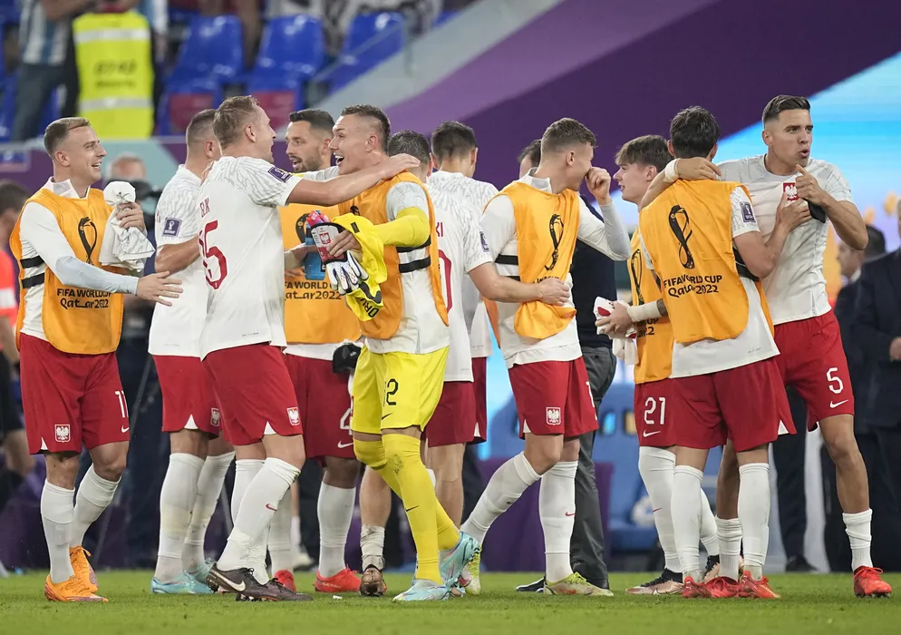 Poland players react at the end of the World Cup group C soccer match between Poland and Argentina at the Stadium 974 in Doha, Qatar, Thursday, Dec. 1, 2022. (AP Photo/Ariel Schalit)