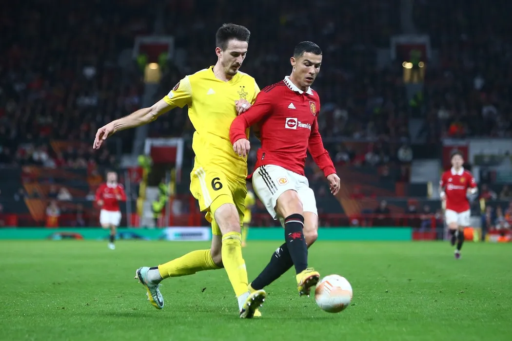 Stjepan Radeljic of Sheriff and Cristiano Ronaldo of Manchester United