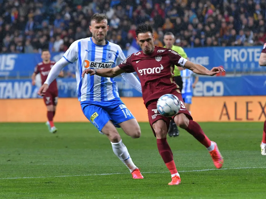 Alexandru Cretu si Mario Camora in meciul de fotbal dintre Universitatea Craiova si CFR Cluj, contand pentru Play-off-ul Ligii 1 Casa Pariurilor, desfasurat pe Stadionul Ion Oblemenco din Craiova, duminica 10 aprilie 2022. © FOTO:Razvan Pasarica/SPORT PICTURES