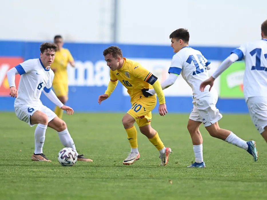Mihai Vlăduț Toma marcheaza un gol de langa Maxim Vikman si Patrik Kristal in meciul de fotbal dintre Romania U17 si Estonia U17, contand pentru Turneul de calificare la Campionatul European 2024, desfasurat la Centrul National de Fotbal de la Buftea, marti 21 noiembrie 2023. © FOTO:Razvan Pasarica/SPORT PICTURES