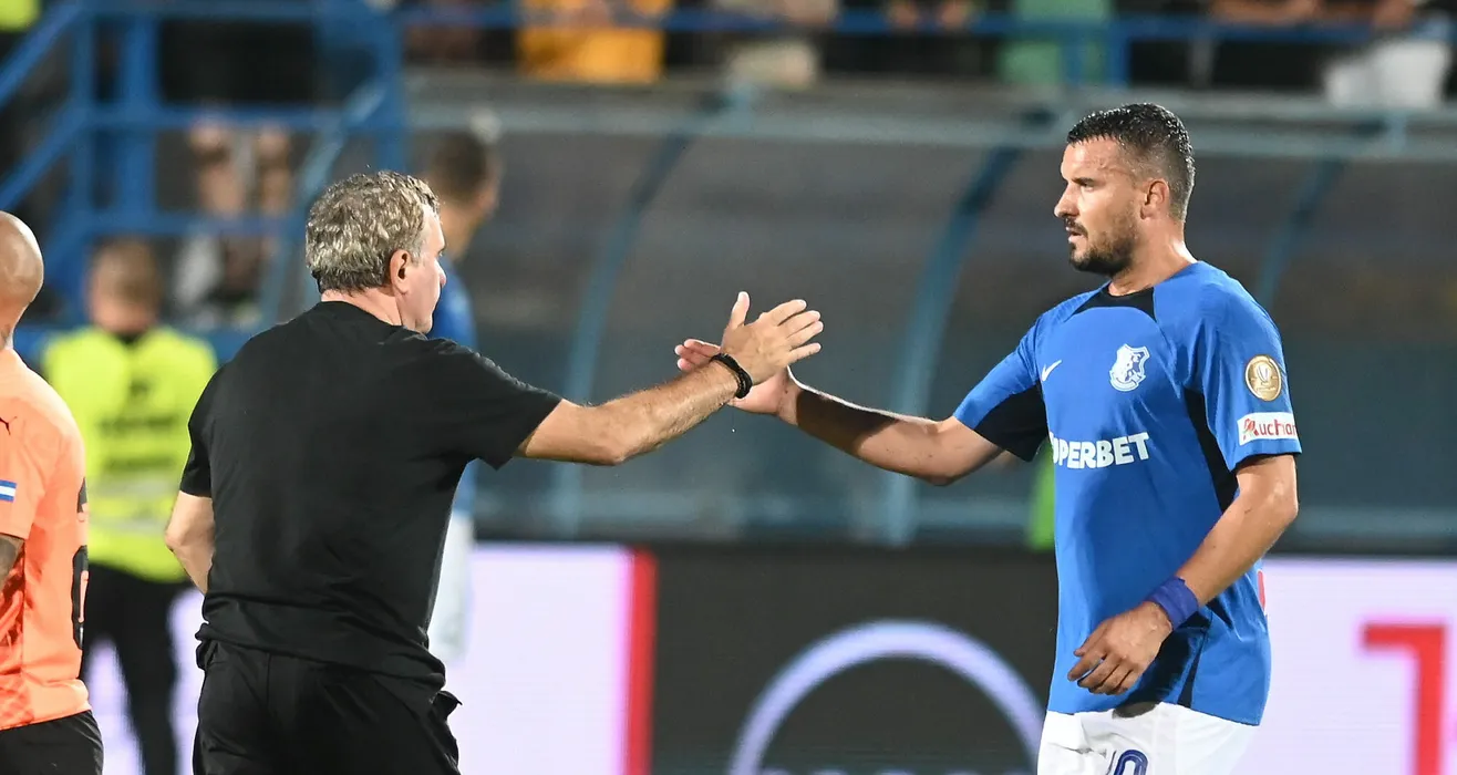 Ionut Alexandru Mitrita, Gheorghe Hagi si Constantin Valentin Budescu se saluta dupa meciul de fotbal dintre Farul Constanta si Universitatea Craiova, contand pentru Superliga Superbet, desfasurat pe Stadionul central al Academiei Gheorghe Hagi din Ovidiu, duminica 27 august 2023. © FOTO:Razvan Pasarica/SPORT PICTURES