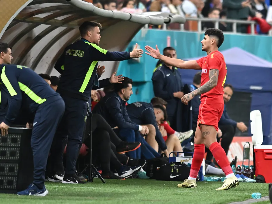 Doru Mihai Pintilii il felicita pe Florinel Teodor Coman la iesirea din teren din meciul de fotbal dintre FCSB si Universitatea Craiova, din cadrul Play-off-ului Superligii Superbet, desfasurat pe Arena Nationala din Bucuresti, duminica 7 aprilie 2024. © FOTO:Razvan Pasarica/SPORT PICTURES