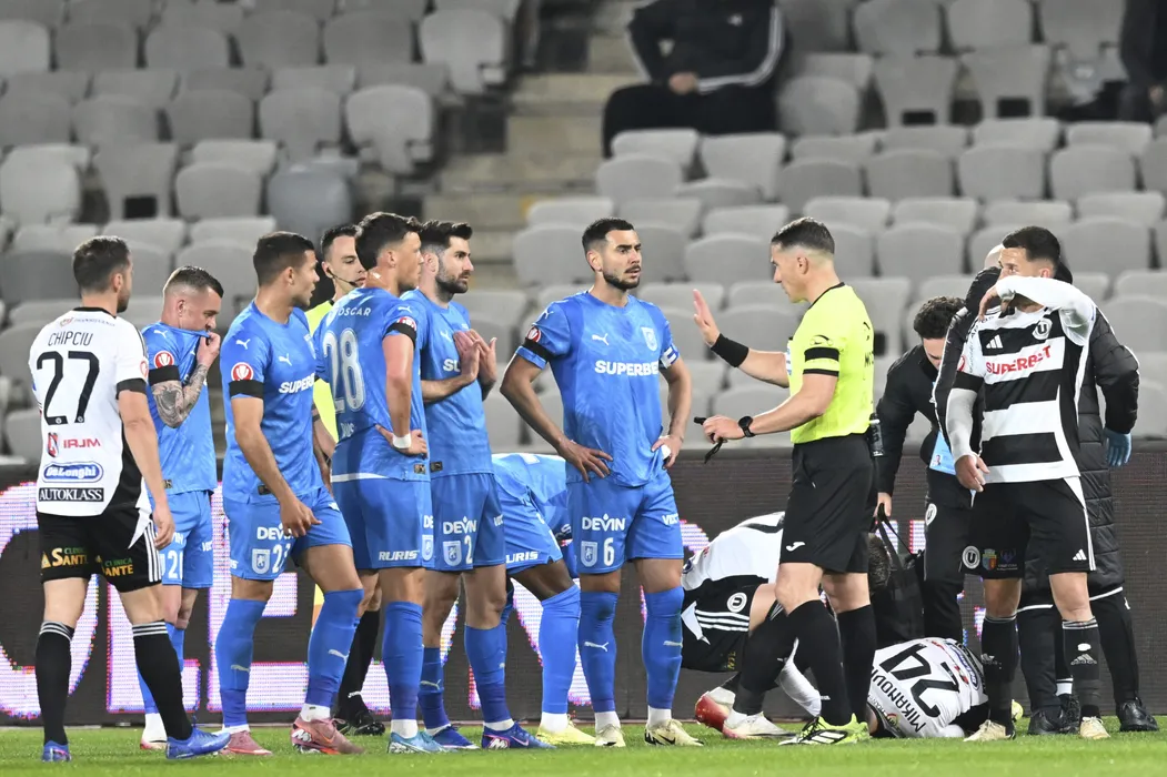 Arbitrul central Istvan Kovacs si Ovidiu Alexandru Bic, Screciu Vladimir Ionuț, Florin Bogdan Stefan, Adrian Rus, Samuel Teles Pereira Nunes Da Silva, Alexandru Cicaldau in meciul de fotbal dintre FC Universitatea Cluj si Universitatea Craiova, contand pentru Superliga Superbet Play-Off, desfasurat pe Cluj Arena din Cluj-Napoca, luni 13 aprilie 2026. © FOTO:Flaviu Buboi/SPORT PICTURES