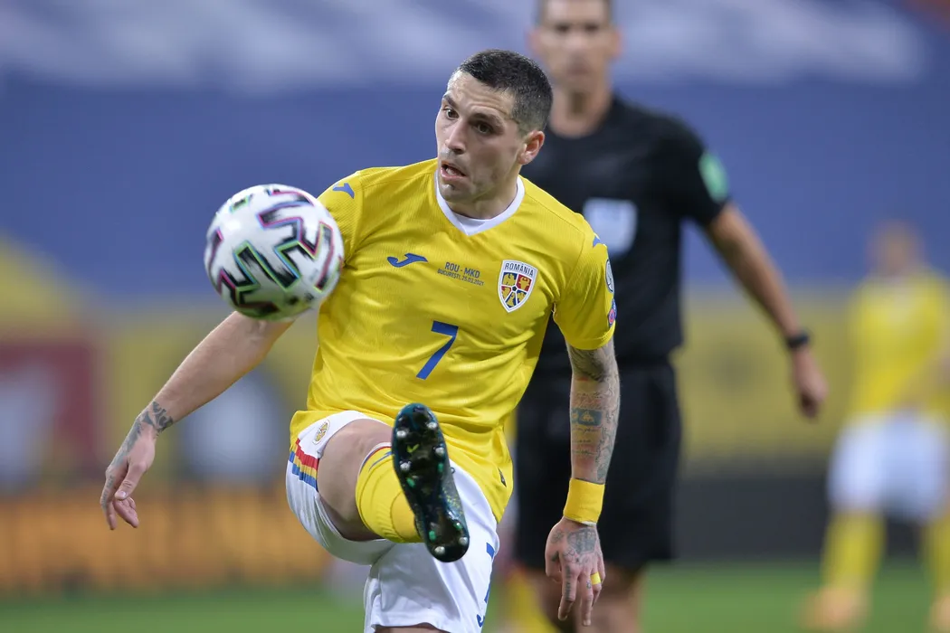Reprezentativele Romaniei (echipament galben) si Macedoniei de Nord s-au intalnit intr-o partida contand pentru preliminariile CM 2022, joi 25 noiembrie 2021, pe Arena Nationala din Bucuresti. ALEXANDRU DOBRE / MEDIAFAX FOTO