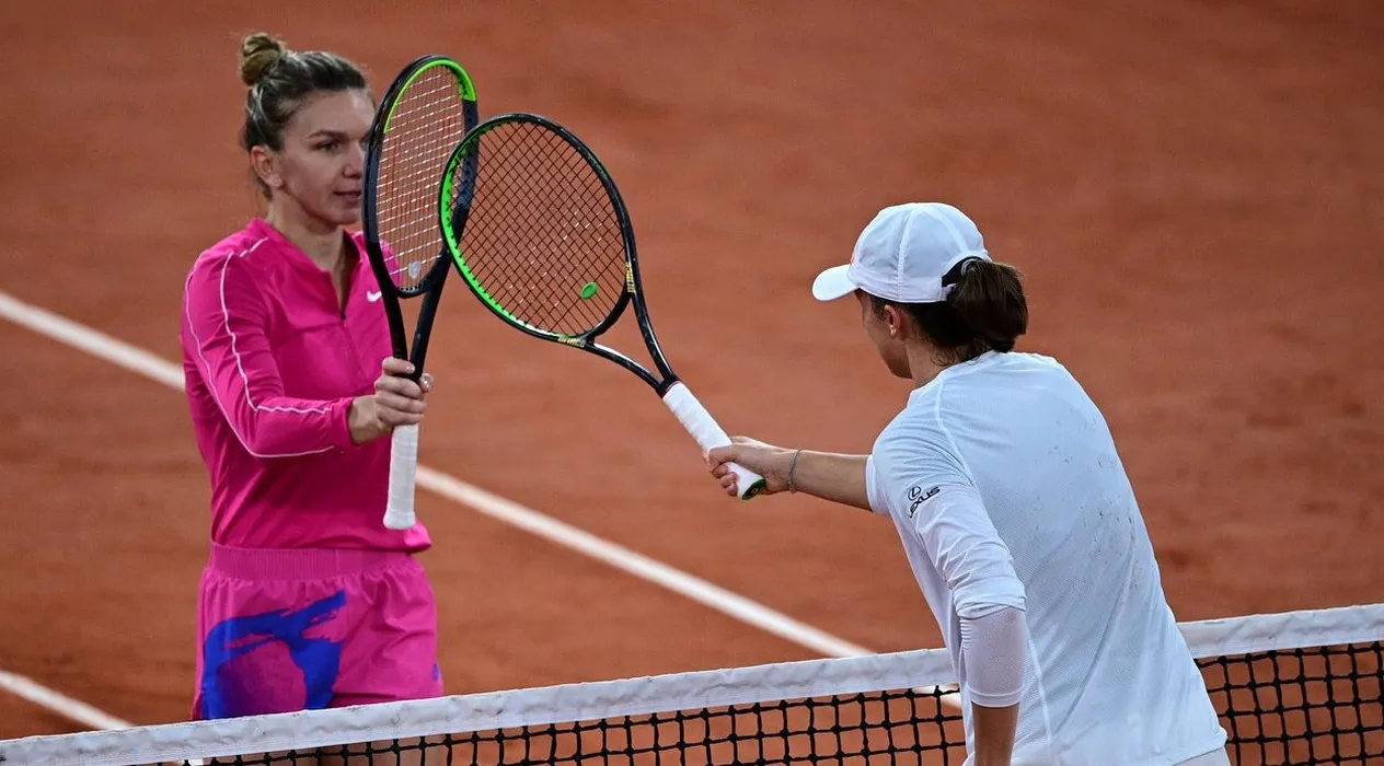 Winner Poland's Iga Swiatek (R) is congratlated by Romania's Simona Halep at the end of their women's singles fourth round tennis match on Day 8 of The Roland Garros 2020 French Open tennis tournament in Paris on October 4, 2020.,Image: 561397056, License: Rights-managed, Restrictions: , Model Release: no