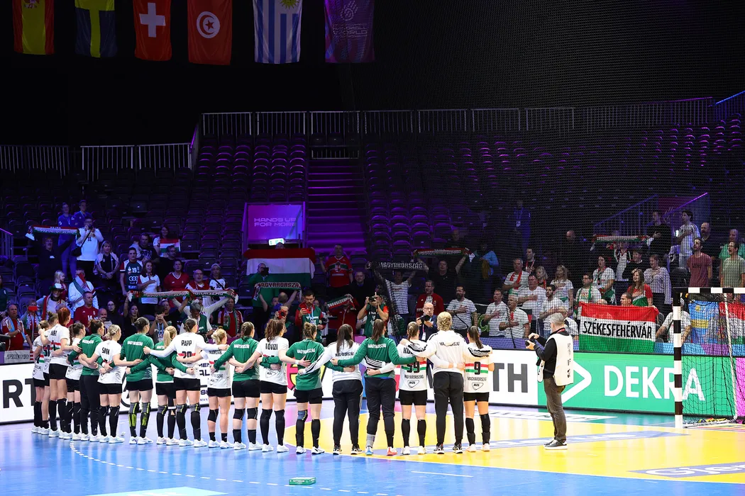 Handbalistele maghiare saluta galeria dupa meciul de handbal feminin dintre Ungaria si Romania, contand pentru Campionatul Mondial de Handbal Feminin 2025, desfasurat la Ahoy Arena din Rotterdam, miercuri 3 decembrie 2025. © FOTO:Sorin Pana/SPORT PICTURES