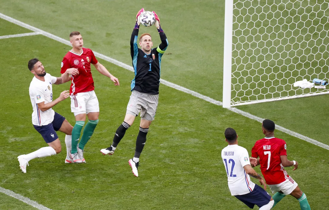 Hungary's goalkeeper Peter Gulacsi reaches up to take the ball during the Euro 2020 soccer championship group F match between Hungary and France at the Ferenc Puskas stadium in Budapest, Hungary, Saturday, June 19, 2021. (AP Photo/Laszlo Balogh,Pool)