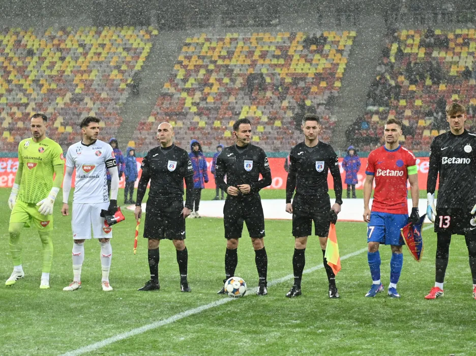 Brigada de arbitri formata din Cristian Daniel Ilinca, Cristian Moldoveanu si Ionel Valentin Dumitru, Matei Alexandru Popa, Darius Dumitru Olaru si Szilárd Veres, Eduard Adrian Pap la startul meciului de fotbal dintre FCSB si FK Csikszereda Miercurea Ciuc, contand pentru Superliga Superbet, desfasurat pe Arena Nationala din Bucuresti, duminica 1 februarie 2026. © FOTO:David Pasarica Mich/SPORT PICTURES