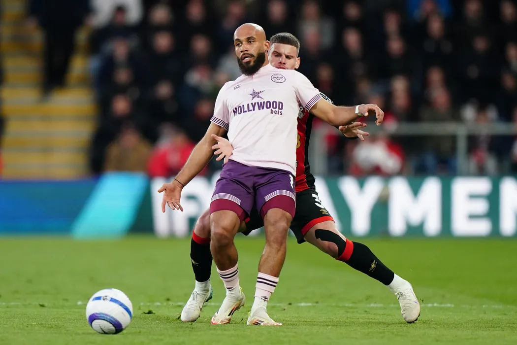 15 March 2025, United Kingdom, Bournemouth: Brentford's Josh Dasilva (L) and Bournemouth's Milos Kerkez battle for the ball during the English Premier League soccer match between AFC Bournemouth and Brentford at Vitality Stadium. Photo: Zac Goodwin/PA Wire/dpa