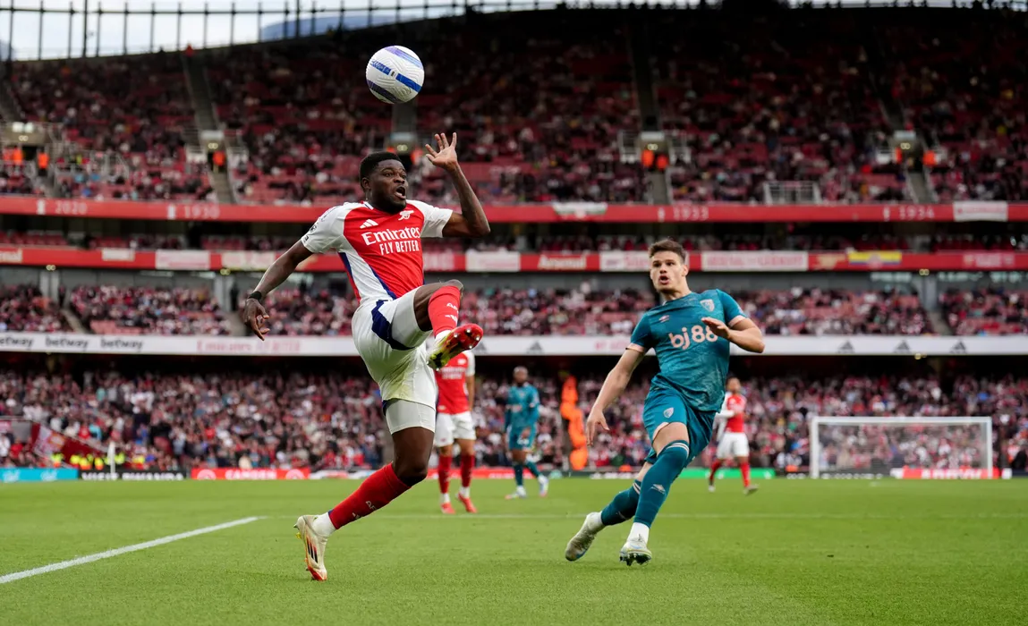 03 May 2025, United Kingdom, London: Arsenal's Thomas Partey (L) and Bournemouth's Milos Kerkez (R) battle for the ball during the English Premier League match between Arsenal and AFC Bournemouth at the Emirates Stadium. Photo: John Walton/PA Wire/dpa