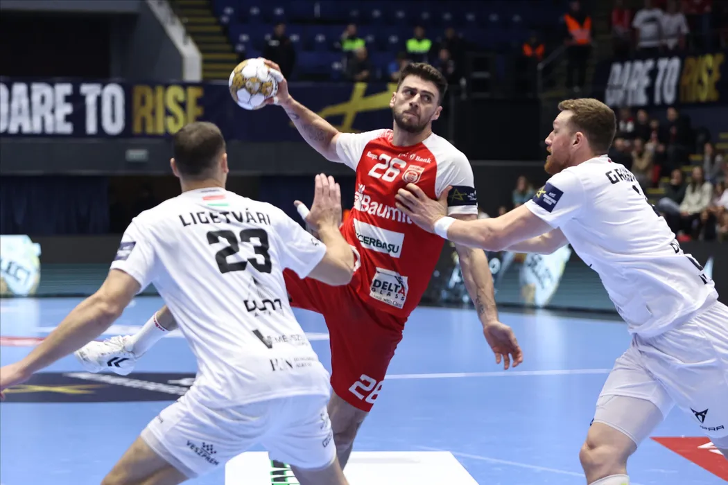 Haniel Vinicius Langaro Inoue si Nikola Grahovac in meciul de handbal masculin dintre CS Dinamo Bucuresti si One Veszprém HC, contand pentru EHF Champions League, desfasurat in Sala Polivalenta Ioan Kunst Ghermanescu din Bucuresti, joi 13 februarie 2025. © FOTO: Gheroghe Fluster/SPORT PICTURES