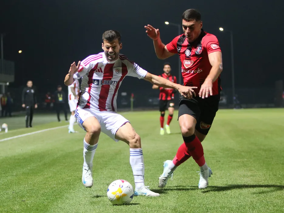 Frederic Ferreira Maciel și Raul Palmeș în meciul de fotbal dintre AFK Csikszereda Miercurea Ciuc și SC Oțelul Galați, contând pentru Cupa României Betano, desfășurat pe Stadionul Municipal din Miercurea Ciuc, miercuri 30 octombrie 2024. © FOTO: Valentin MUNTEANU/SPORT PICTURES