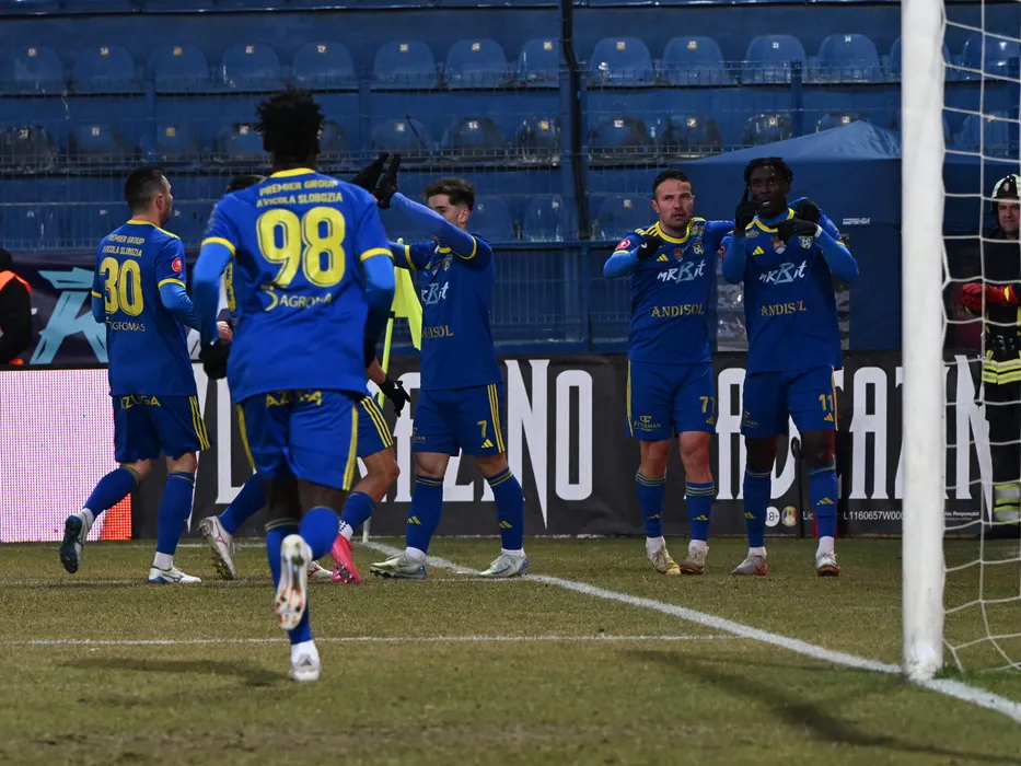 Bucurie a fotbalistilor din Slobozia Florin Flavius Purece, Laurentiu Constantin Vlasceanu si Adnan Aganovic dupa un gol marcat de catre Jordan Youri Gele in meciul de fotbal dintre Unirea Slobozia si Sepsi OSK Sfantu Gheorghe, din cadrul Superligii Superbet, desfasurat pe Clinceni Arena din Clinceni, vineri 17 ianuarie 2025. © FOTO:Razvan Pasarica/SPORT PICTURES