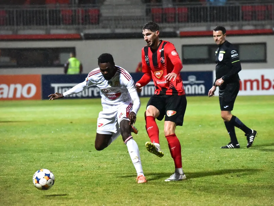 Arbitrul central Catalin Busi urmareste duelul dintre Dimitri Joseph Oberlin si Bence Végh in meciul de fotbal dintre FK Csikszereda Miercurea Ciuc si ACS Sepsi OSK Sfantu Gheorghe, contand pentru Cupa Romaniei Betano, desfasurat pe Stadionul Municipal din Miercurea Ciuc, marti 28 octombrie 2025. © FOTO:Zoltan Pal/SPORT PICTURES