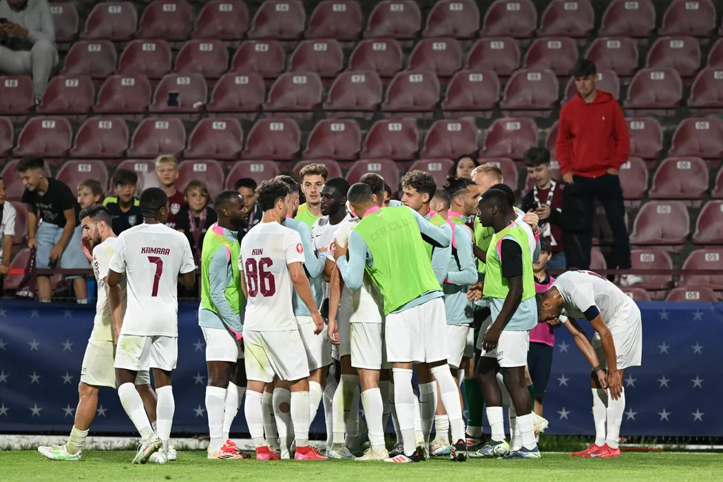 Fotbalistii ceferisti se bucura dupa un gol marcat in meciul de fotbal dintre FC CFR 1907 Cluj si AFC Unirea 04 Slobozia, contand pentru Superliga Superbet, desfasurat pe Stadionul Dr.Constantin Radulescu din Cluj-Napoca, duminica 13 iulie 2025. © FOTO:Flaviu Buboi/SPORT PICTURES