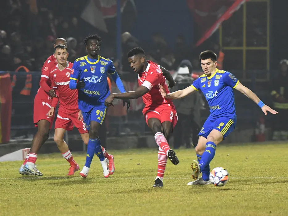Vhakka Eddy Stelh Gnahore, Raul Marian Oprut si Ionut Viorel Coada, Nkama Christ Afalna in meciul de fotbal dintre Unirea Slobozia si Dinamo Bucuresti, din cadrul Superligii Superbet, desfasurat pe Clinceni Arena din Clinceni, vineri 31 ianuarie 2025. © FOTO:Petronel Tudor/SPORT PICTURES