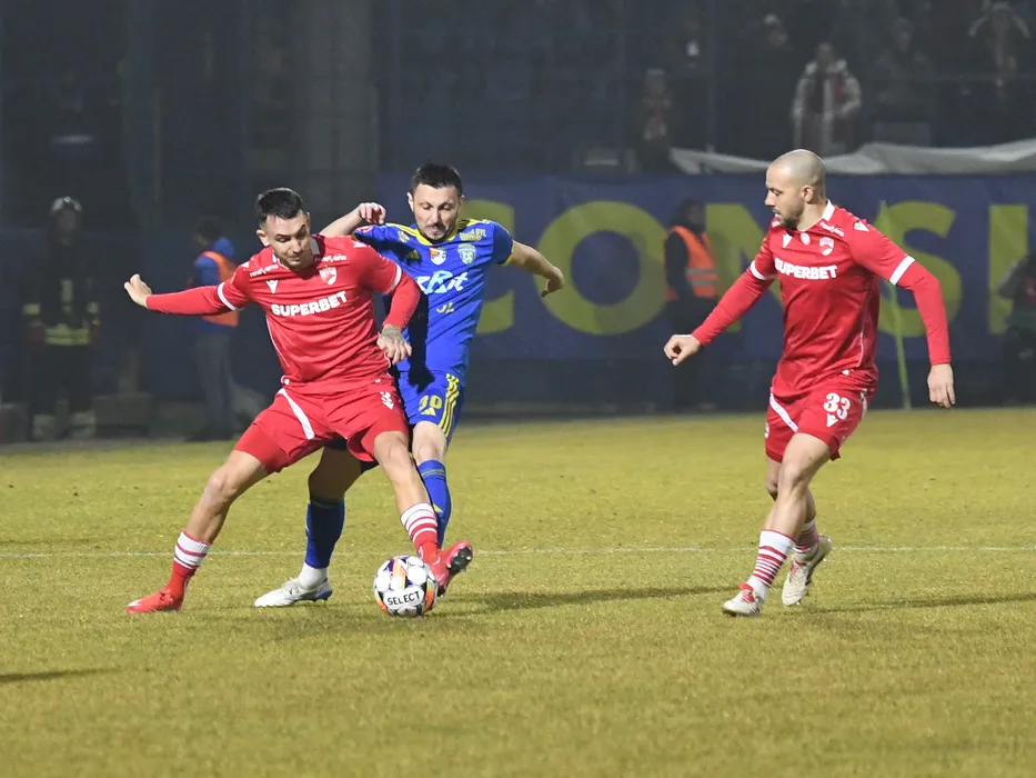 Florin Flavius Purece si Georgi Milanov Ventsislavov, Patrick Haakon Olsen in meciul de fotbal dintre Unirea Slobozia si Dinamo Bucuresti, din cadrul Superligii Superbet, desfasurat pe Clinceni Arena din Clinceni, vineri 31 ianuarie 2025. © FOTO:Petronel Tudor/SPORT PICTURES