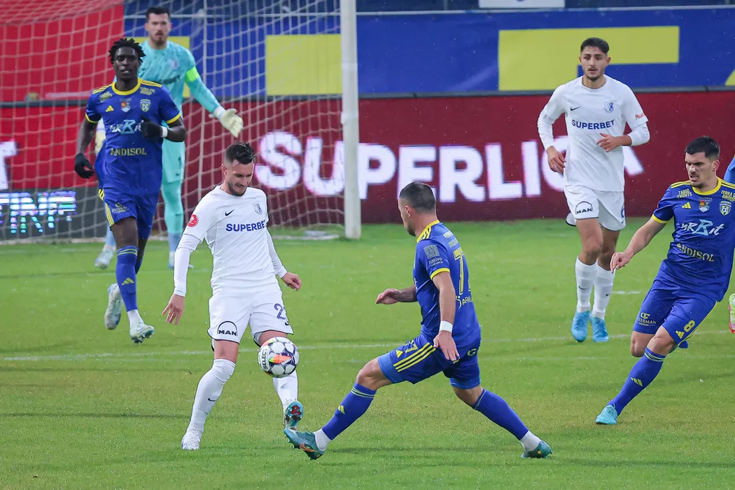 Roberto Carlo Casap, Victor Robert Dican și Ionuț Viorel Coadă, Jordan Youri Gele în meciul de fotbal dintre AFC Unirea 04 Slobozia și FC Farul Constanța, contând pentru Superliga Superbet, desfășurat pe Stadionul din Clinceni, duminică 10 noiembrie 2024. © FOTO: Mihai-Antonio VASILE/SPORT PICTURES