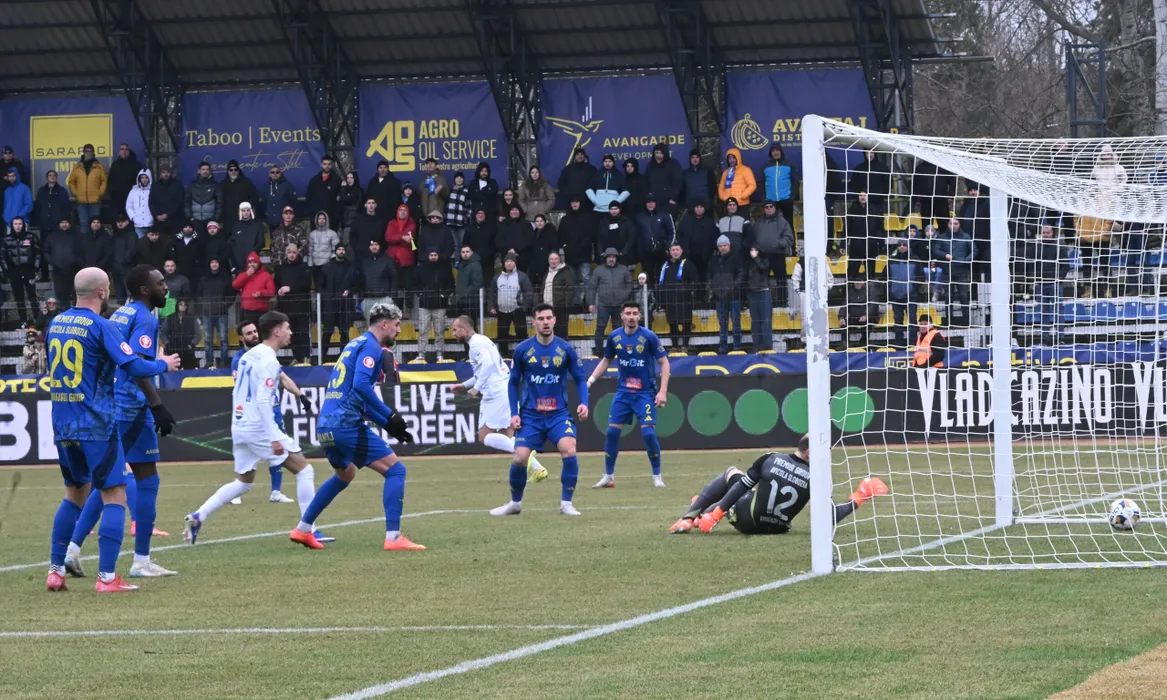 Denis Alibec marchează un gol în poarta lui Denis Rusu sub privirile lui Razvan Andrei Tanasa si Alexandru Cristian Albu in meciul dintre Unirea Slobozia si Farul Constanta, contand pentru Superliga Superbet, desfasurat pe Stadionul 1 Mai din Slobozia, sambata 7 februarie 2026. © FOTO:Razvan Pasarica/SPORT PICTURES