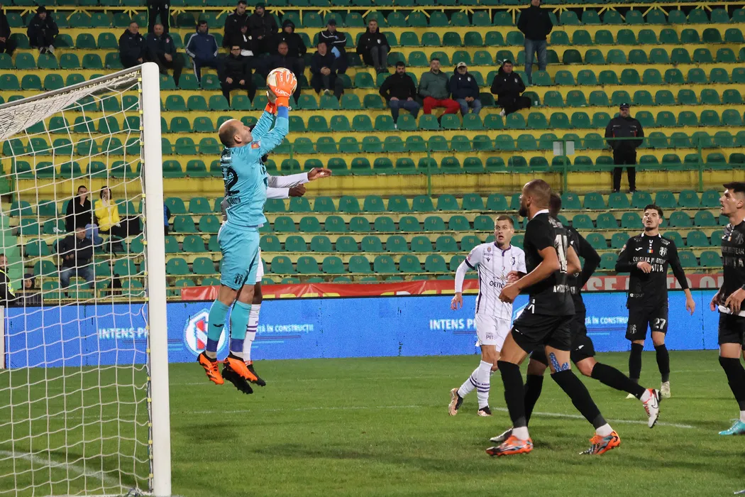 Denis Rusu prinde mingea din fața lui Bogdan Gheorghe Rusu în meciul de fotbal dintre ACS CAMPIONII FC ARGES si AFC UNIREA 04 SLOBOZIA contând pentru Liga 2 Casa Pariurilor, desfășurat pe Stadionul Orășenesc Mioveni, vineri 10 noiembrie 2023. © FOTO: Gabriela NEACSU/SPORT PICTURES